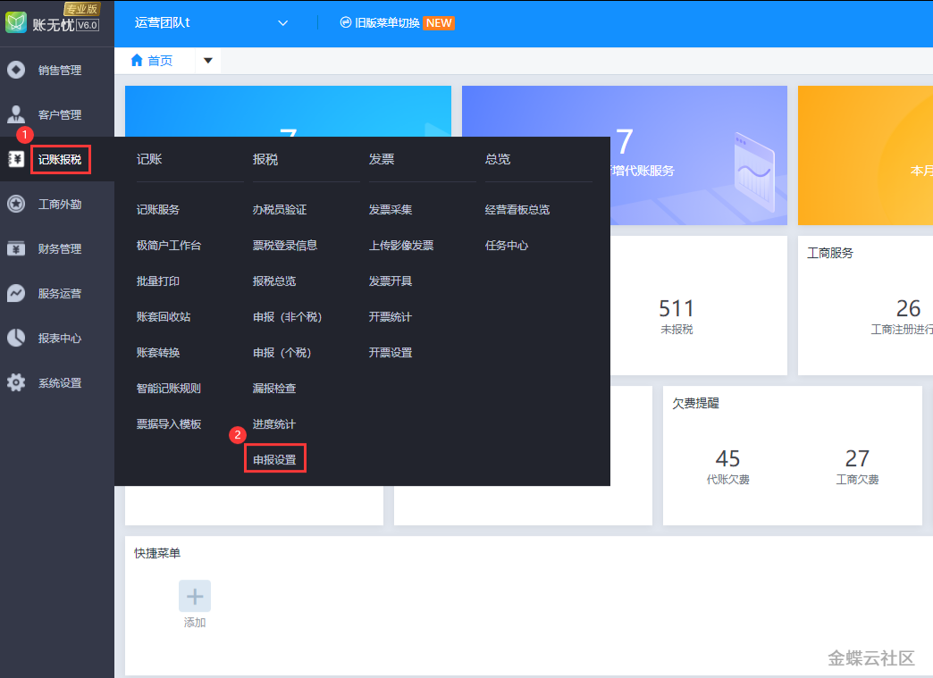登錄系統后,進入【記賬報稅】模塊,在功能列表中找到并點擊【申報設置】;