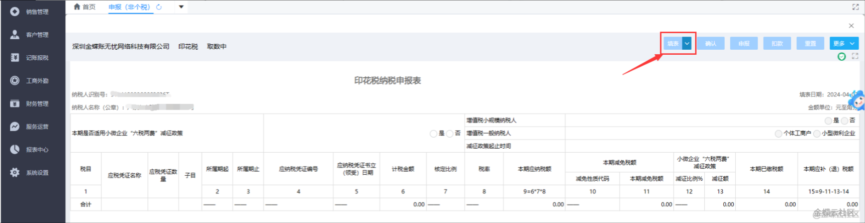 打開申報表后,點擊界面右上角的【填表】按鈕,系統會自動按照步驟 1 預設的規則,提取符合條件的數據并填充至申報表對應欄目。